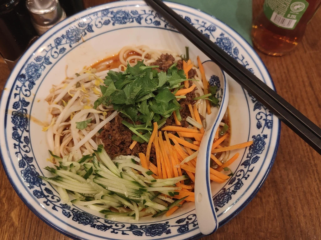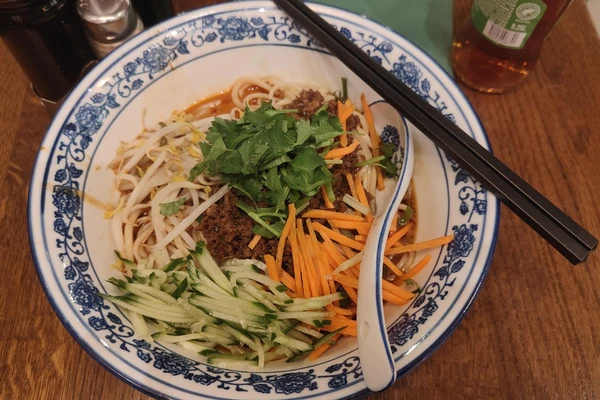 "Dandan noodles (traditional Chinese: 擔擔麵; simplified Chinese: 担担面; dandanmian, literally 'carrying pole noodles') are a Chinese noodle dish originating from Sichuan cuisine. The dish consists of wheat noodles served with a spicy sauce that usually contains pickled vegetables such as zha cai (lower mustard stems) or ya cai (upper mustard stems), chili oil, Sichuan pepper, and minced pork, and is topped with scallions and peanuts. [...]" -- https://en.wikipedia.org/wiki/Dandan_noodles